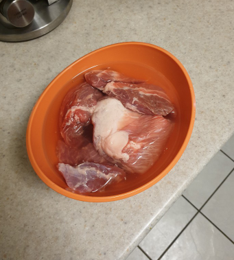 1. 목살을 찬물에 10분정도 담궈서 부유물을 빼줍니다.