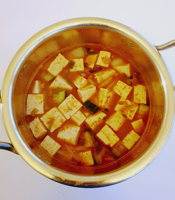4. 어느정도 야채가 익을때쯤에 두부와 고추가루를 넣어줍니다.